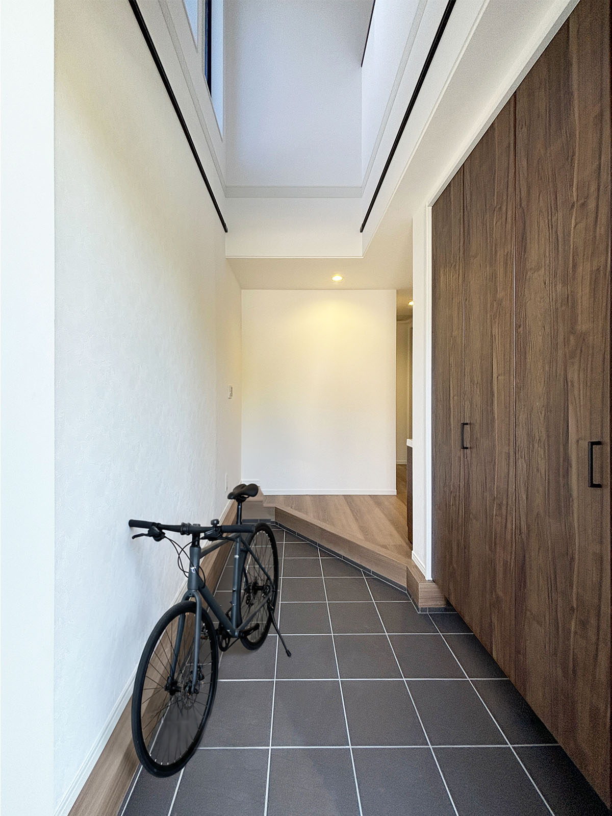 吹き抜けから光が差し込む、明るい玄関。広くとった土間は、収納スペースとしても活躍。