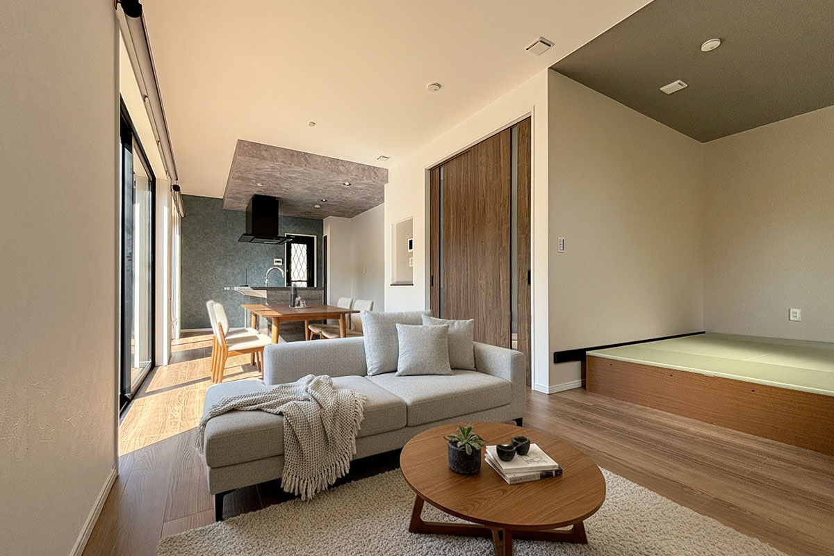大きな窓から外の景色を楽しめるLDK。置き畳は腰をかけてくつろいだり、暮らし方に合わせて自由に使えます。