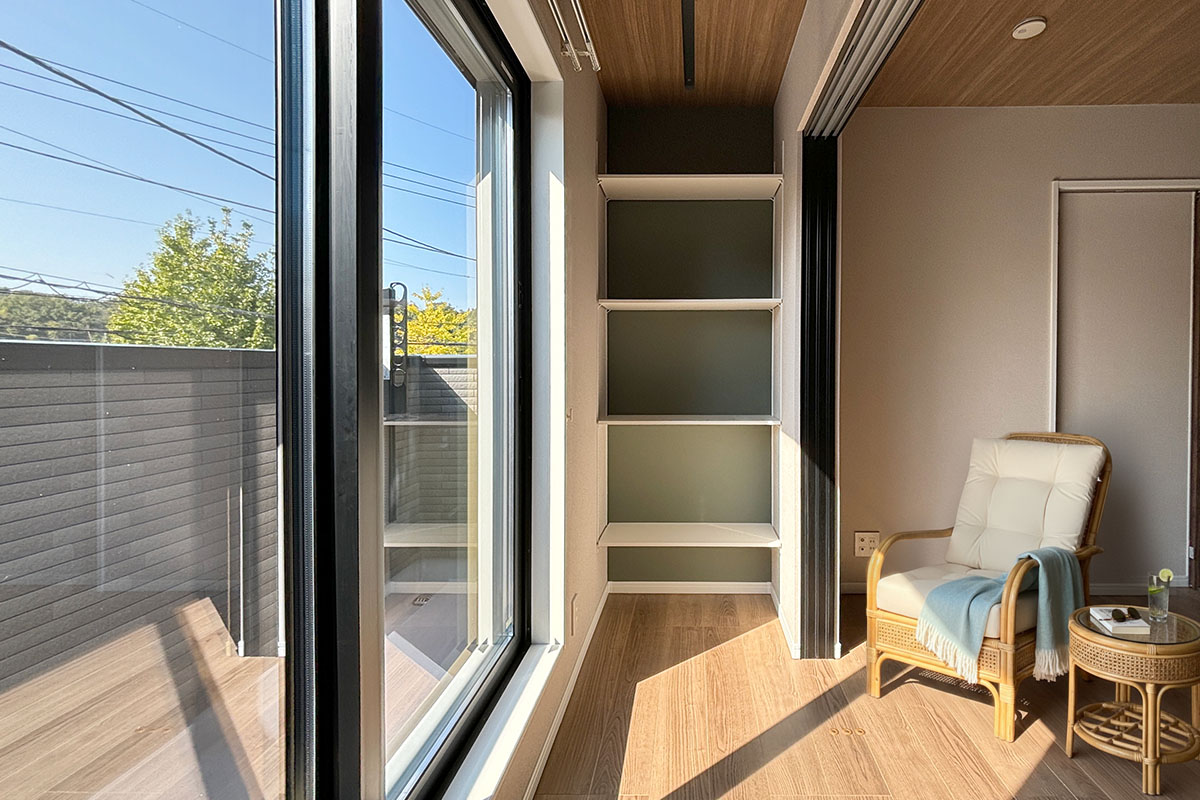 陽の光が心地よく差し込むサンルーム。洗濯物を干したり、読書を楽しんだりと、多目的に活用できます。