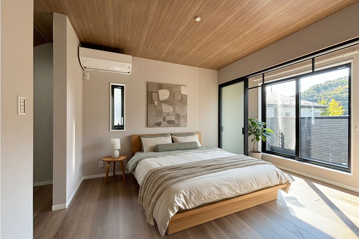 明るい日差しが差し込む主寝室。ウォークインクローゼットとサンルームが隣接しており、使い勝手のよい動線です。
