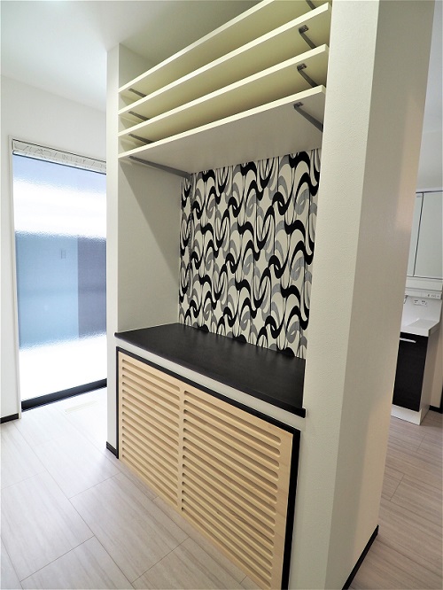 アクセントのある壁紙はテレビが見やすく、リビング横にワークスペースを設け、趣味の時間やおうちでのお仕事にも対応可能です