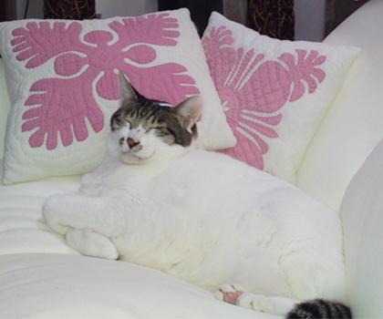 ハワイで購入してきたハワイアンキルトのクッションは猫たちもお気に入りなのかも!? リラックスした猫といっしょにT様のお部屋を彩ります