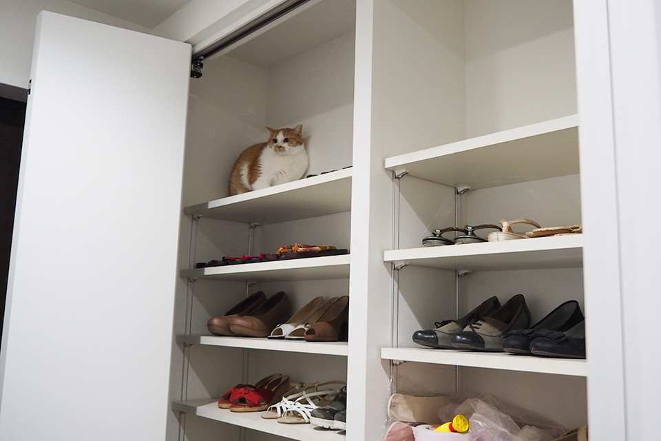 さて猫はどこにいるでしょう? 正解はシューズクローゼットの最上部です。「ステップがなくても器用にのぼって隠れ家にしているんですよ」とT様も驚かれています