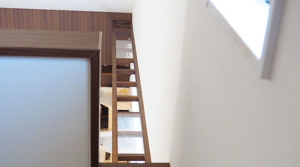 T様邸のリビングは2階に計画されています。玄関から階段をのぼって2階にたどり着くと、そこは開放的なLDK。冷暖房効率を考えて、リビングと階段の境目に扉を付ける家も少なくないなかで、あえて扉を付けていない理由についてお聞きすると、「私がいないときも猫たちが自由に家の中を行き来できるように、あまりドアを付けないで欲しいとオーダーしました」とのことでした。