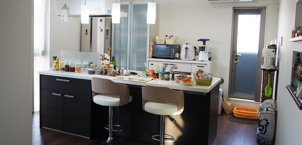 新築してからというもの、T様の近所に住む同級生たちが集まって、パーティをする機会が増えたそうです。アイランドキッチンはぐるぐるっと回遊できる動線のため、親しい人がキッチンに立ってパーティの準備をすることも容易にできます。