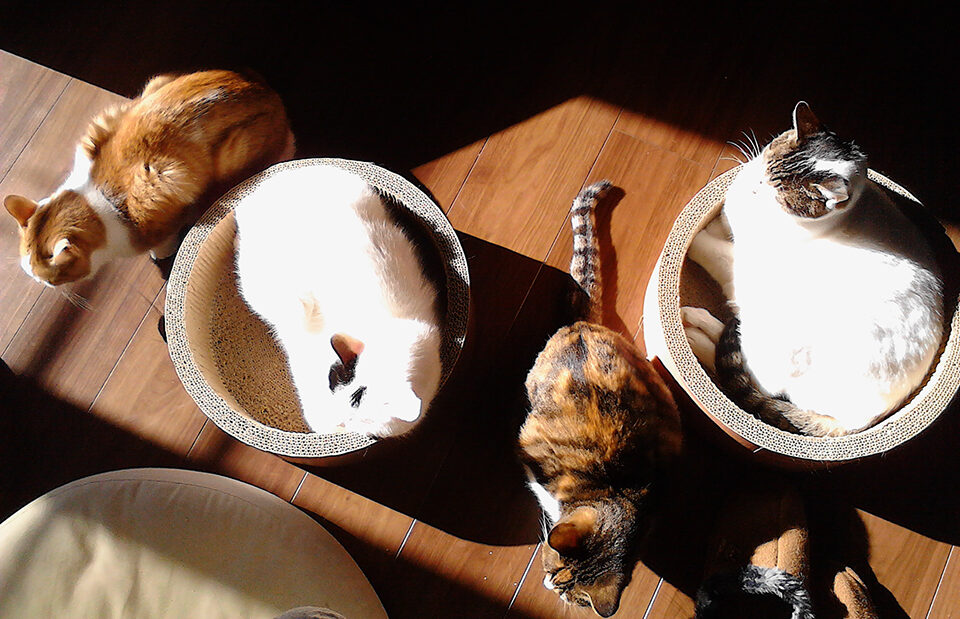 猫たちが寛ぐのは南面にあるバルコニー付近です。陽だまりができると、ここぞとばかりに集まってきてはウトウトと「日差しの毛布」を掛けてお昼寝をするそう。