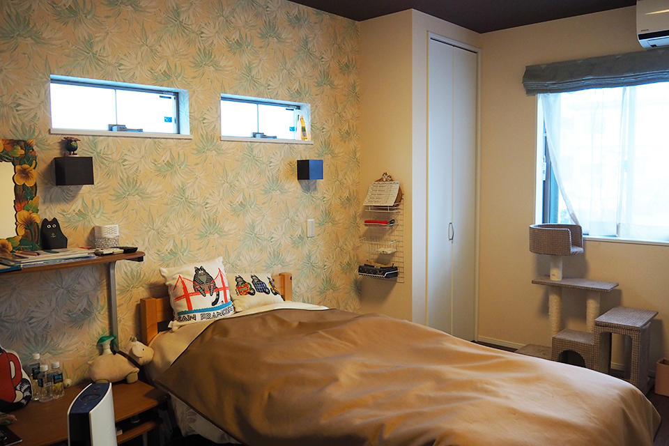 特に寝室は、かわいらしいハワイアン模様の壁紙と、ラタン調の天井でコーディネートしました。「ショールームでこのコーディネートを見させてもらったときに、絶対に真似したい!って思って」とT様。