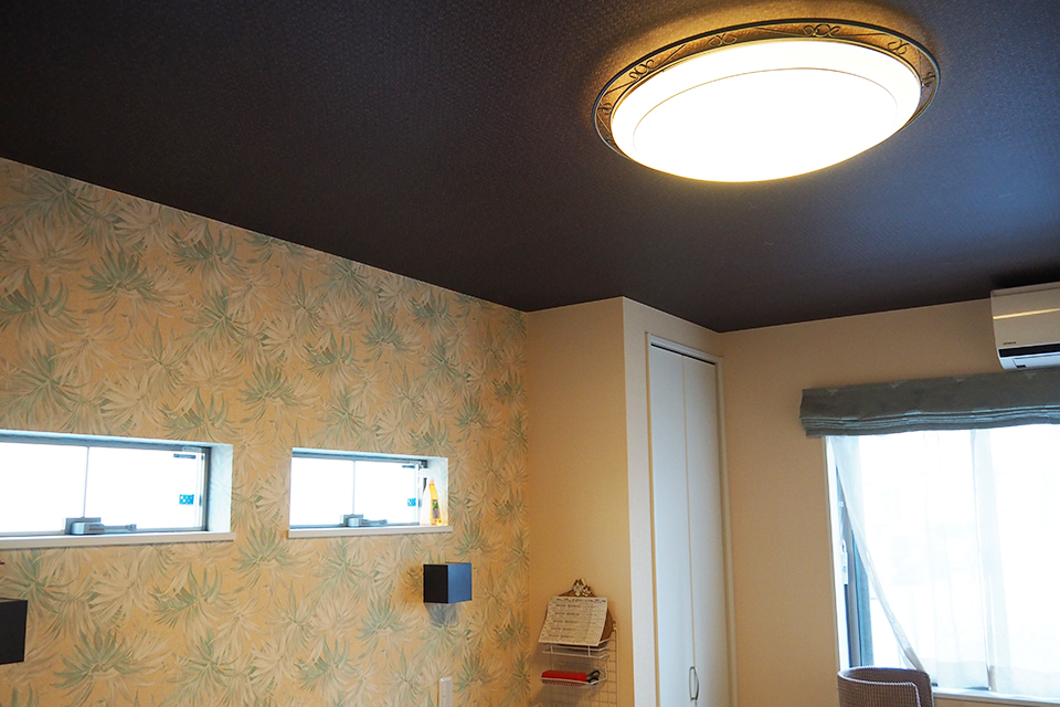 天井は植物を編んだような模様の「ラタン調」のクロスを使って、リゾート気分を盛り上げて。ダークブランを使うことで空間が引き締まります