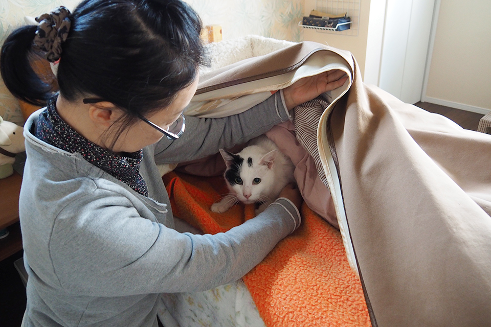 布団の中が避難場所に。掛け布団をめくると、2~3匹の猫がぬくぬくと集まっていました